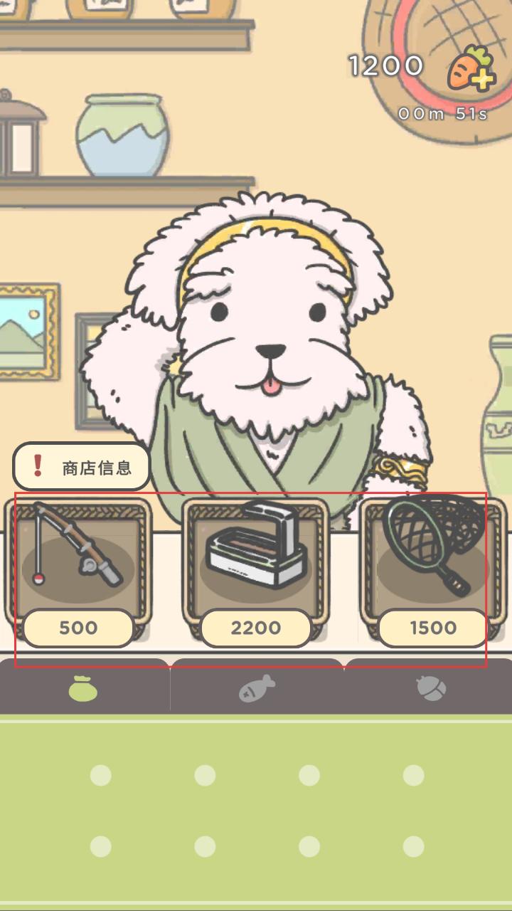 3、进入商店,能看到小狗售卖钓鱼竿、订书机、网子等物品,根据自己的需求,选择想要的物品。