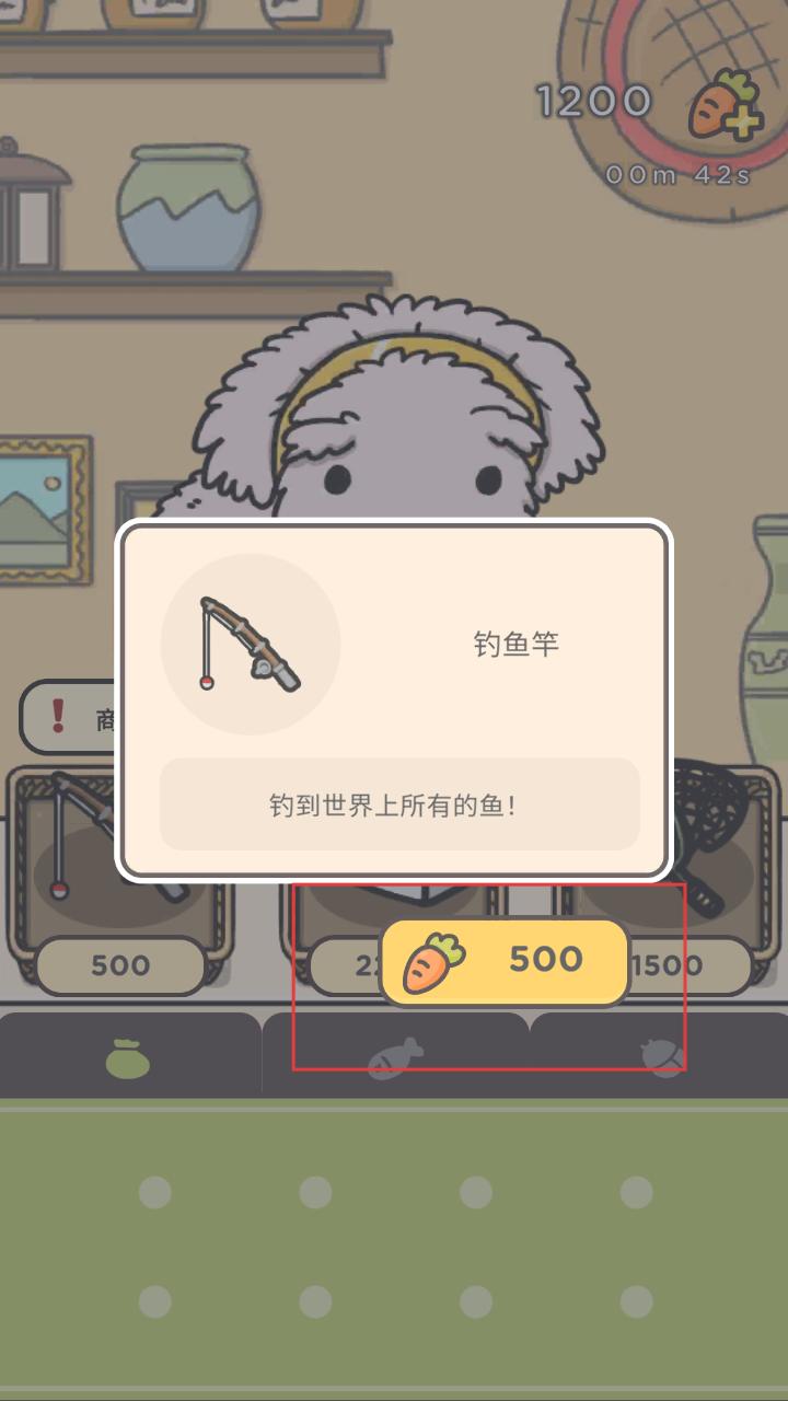 4、若选择购买钓鱼竿,花费500个胡萝卜,就能得到它,之后就可以用钓鱼竿去钓鱼,尝试钓到各种鱼类。