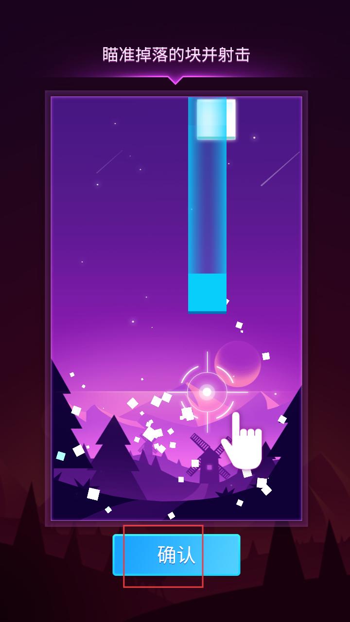 1、进入游戏,能看到有确认按钮的界面,点击确认,即可开启结合音乐与射击的游戏体验。