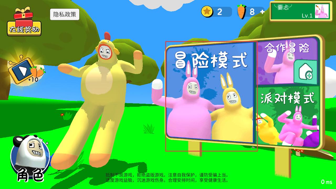 1、在主界面可选择冒险模式、合作冒险、派对模式,选好模式后开启魔性的兔子人冒险之旅。