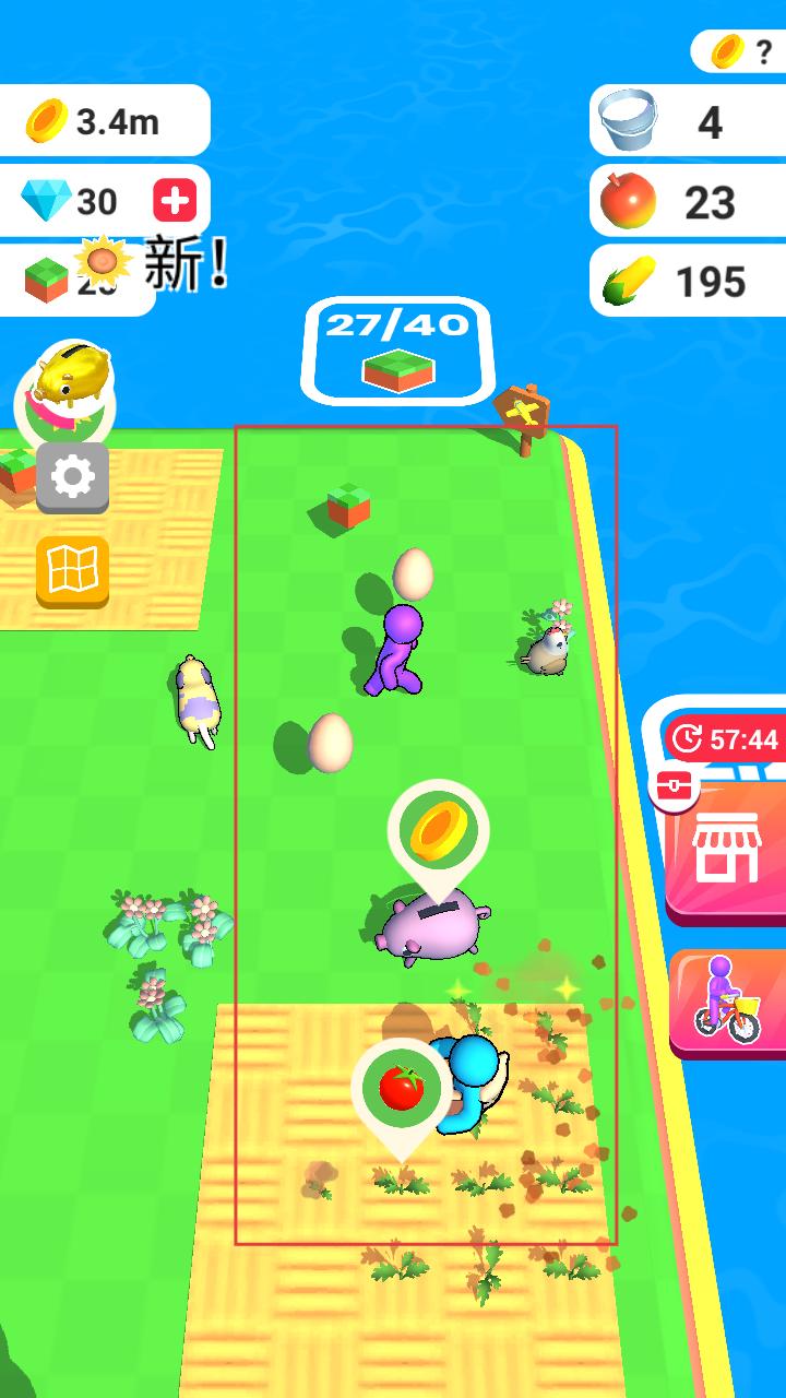 3、在农场中收集鸡蛋,查看存钱罐和作物标识,管理养殖和种植产出,同时与其他角色互动,丰富农场经营的多样活动。