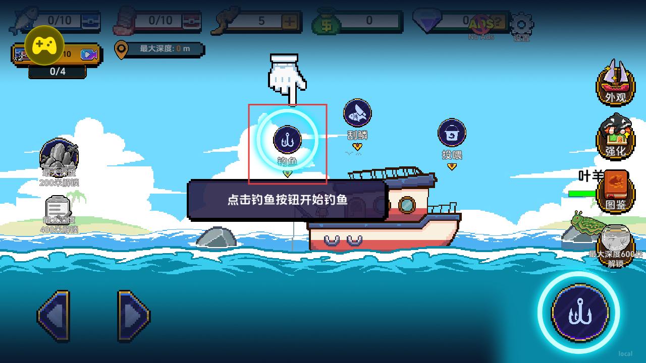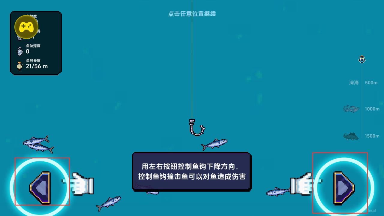 3、用左右按钮控制鱼钩下降方向,通过撞击鱼造成伤害,精准操作可提升钓鱼效率。