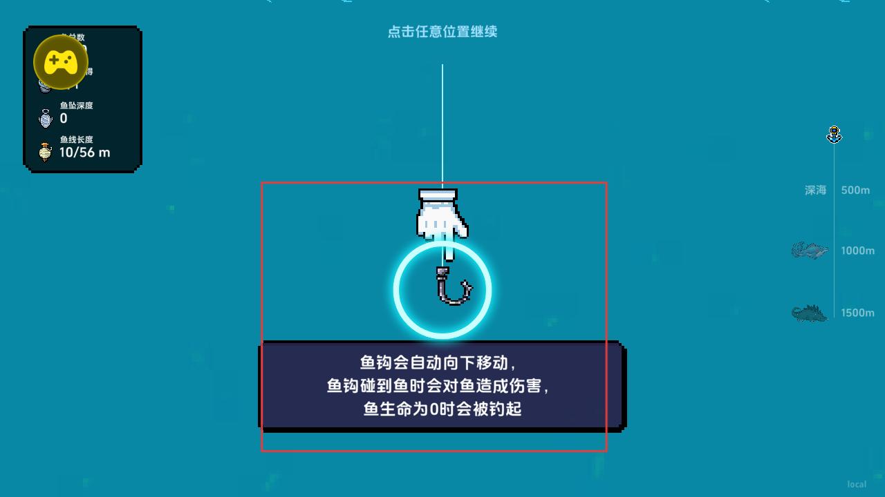 2、鱼钩会自动向下移动,碰到鱼时对鱼造成伤害,鱼生命为0时会被钓起,这是钓鱼的核心机制。