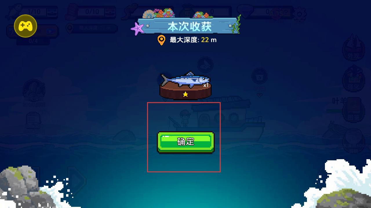 4、钓鱼收获后点击确定按钮,完成本次钓鱼流程,记录收获的鱼类与最大深度等信息。