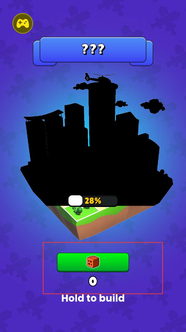 1、在建筑界面按住绿色方块按钮进行建造,进度条显示建造进度,逐步解锁城市建筑,为黑洞吞噬玩法构建场景,开启城市吞噬的趣味准备阶段。