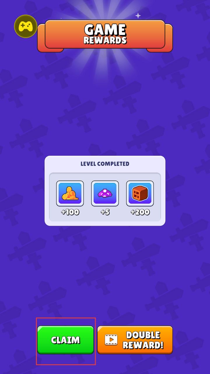4、完成关卡后进入奖励界面,点击CLAIM按钮领取金币、紫晶、建筑方块等奖励,积累资源用于解锁新关卡或升级黑洞,推动游戏进程。