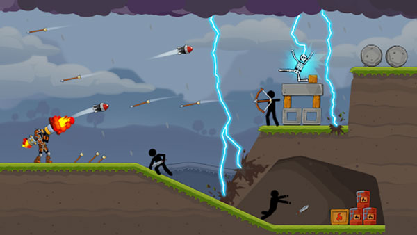 2、拉拽屏幕调整火箭筒角度与力度,沿抛物线轨迹发射炮弹,摧毁敌人建筑与士兵。