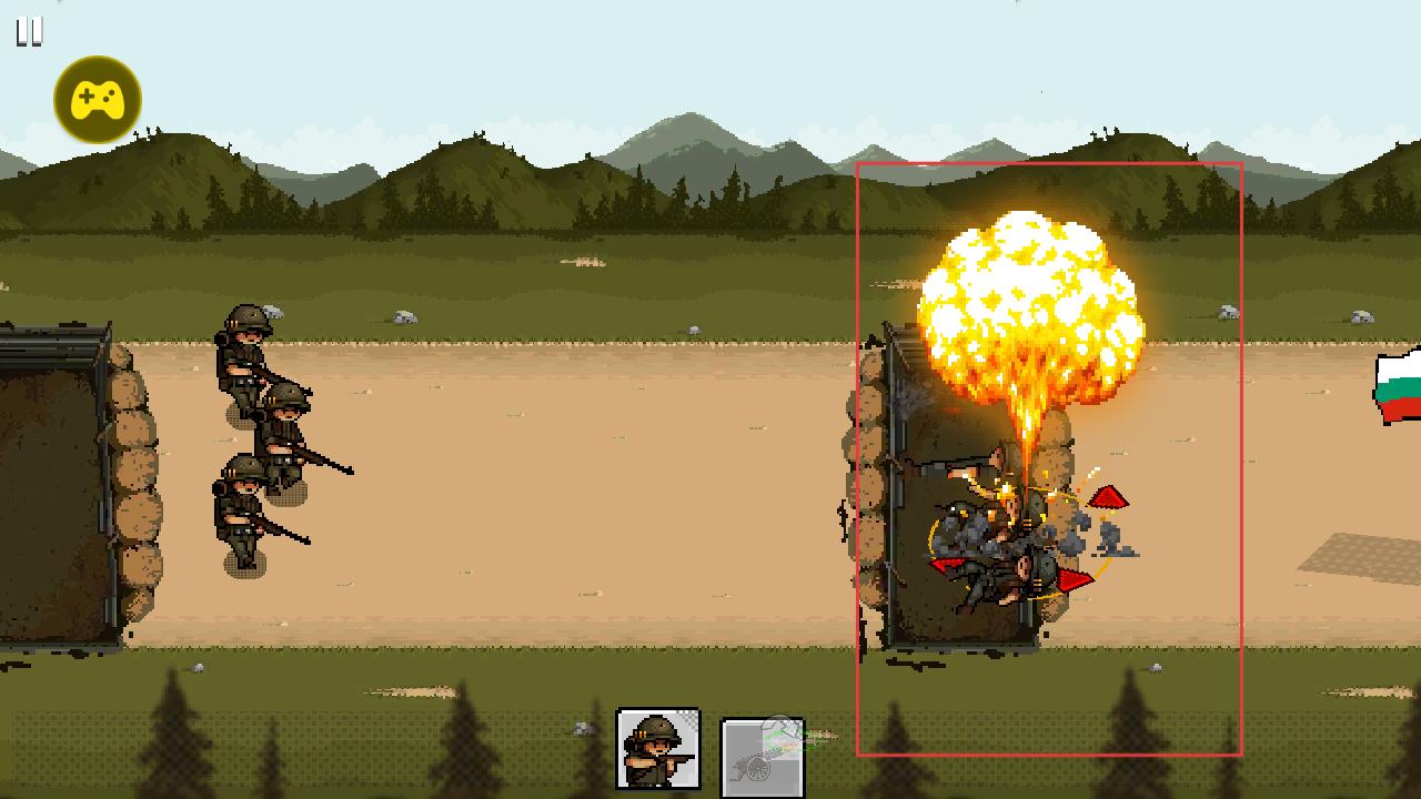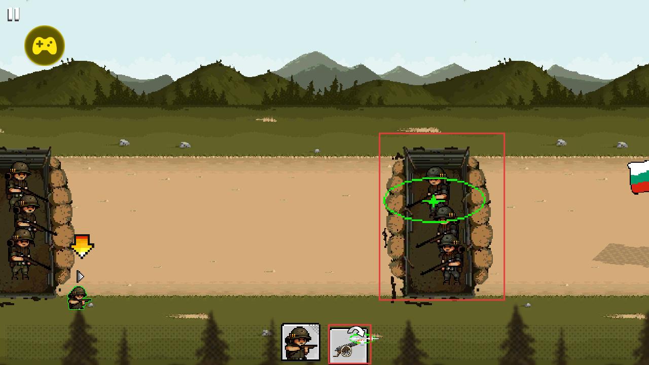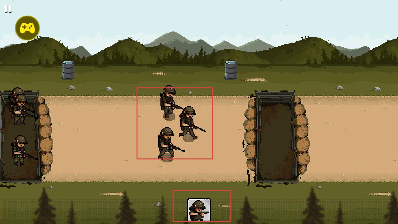 1、点击下方士兵图标,部署士兵从战壕出发,在战场中移动进攻,利用人数优势推进战线,为夺取敌方战壕创造条件。