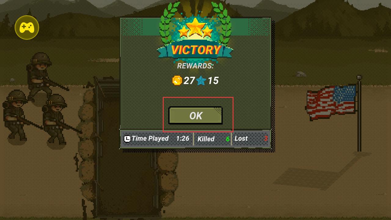 4、战斗胜利后,会出现VICTORY界面,显示获得的金币和星星奖励,点击OK按钮领取奖励,可继续挑战新的战役。