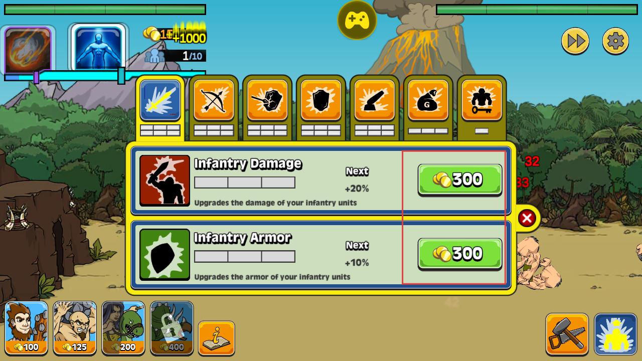 4、花费金币升级步兵伤害、护甲等属性,提升单位战力,助力在不同时代的征战中取得优势。