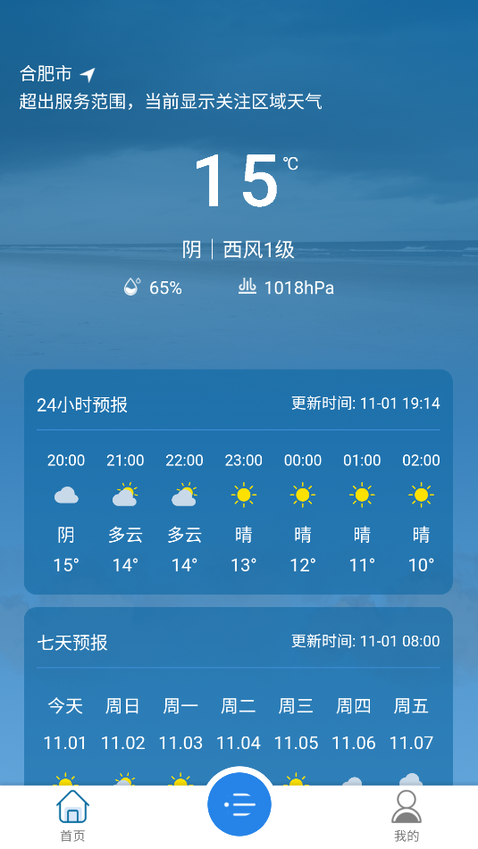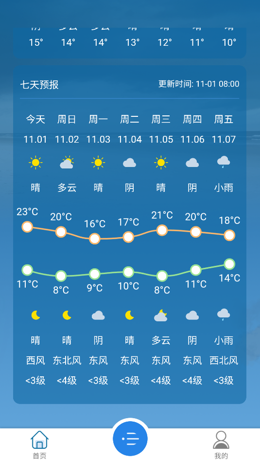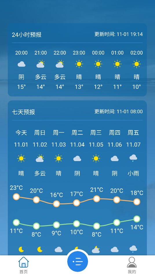 2、页面中可查看24小时和7天内的天气预报情况,气温、湿度等。