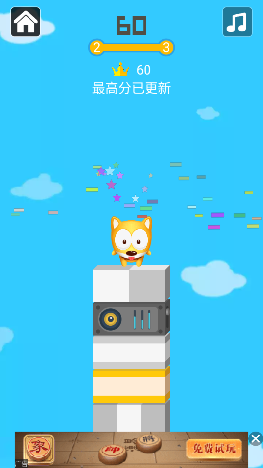 3、一层层往上跳跃,叠高,超过上方的水平线时,即可通关。