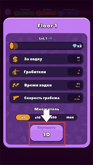 3、进入楼层升级界面,点击升级按钮,可提升楼层的收入、抢劫者数量、移动时间等属性,大幅提高财富获取效率,加速商业帝国成长。