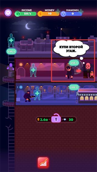 1、进入游戏操控角色开展地下交易经营,界面上方显示收入、金钱等数据,通过互动开启财富积累之旅,开启黑手党大亨的商业帝国构建。