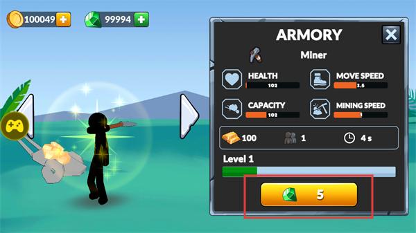 2、进入ARMORY界面,可查看矿工属性,花费钻石升级其生命值、移动速度等,提升矿工战力,助力资源采集与战斗。