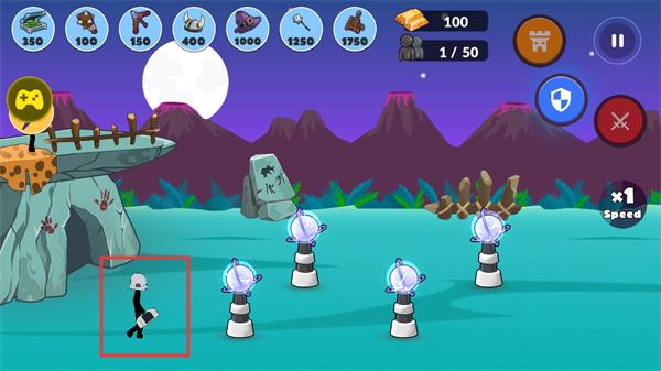 4、在战场中部署矿工采集资源,布置防御塔等建筑,指挥火柴人部队作战,合理布局资源与兵种,推进战局获取胜利。