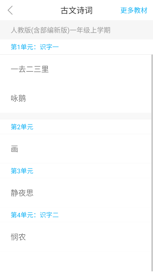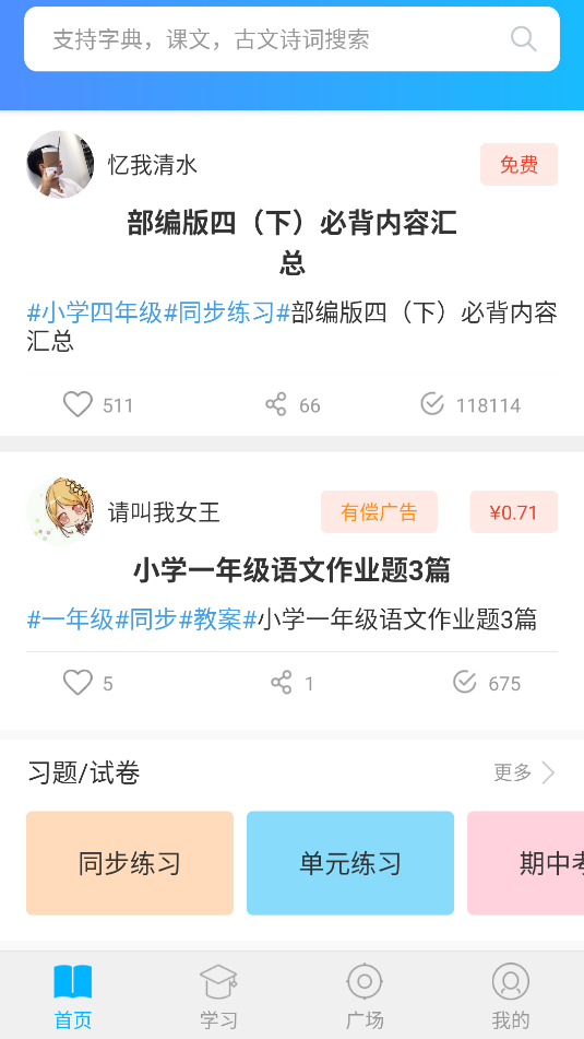 1、打开APP,在首页中可输入关键词搜索需要的课文与古诗词等,点击下单的选项可进入学习。