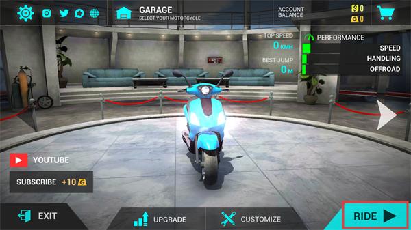 1、进入车库选择摩托车,点击RIDE按钮,即可开启在开放世界中的摩托车骑行冒险,准备体验拟真的骑行乐趣。