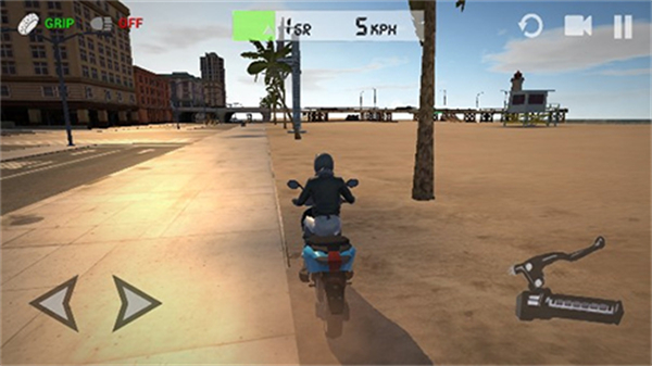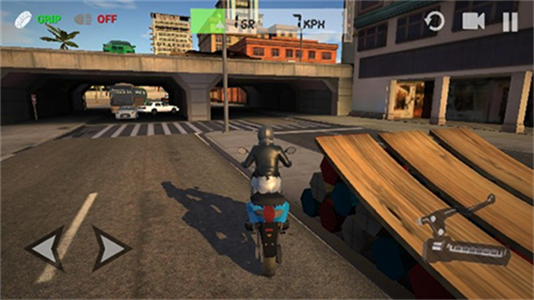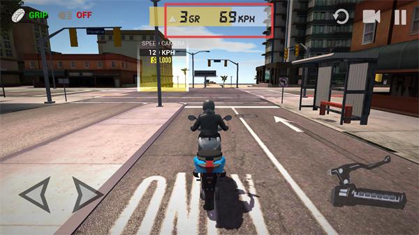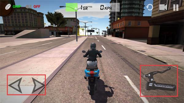 2、在城市街道骑行时,通过左侧方向键控制方向,点击右侧油门加速,在开放式地图中开始你的摩托车驾驶之旅。