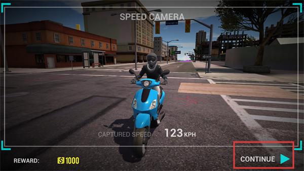4、完成速度挑战后,界面会显示捕捉到的速度和奖励,点击CONTINUE继续游戏,可获得金币奖励,继续探索开放世界或参与其他摩托车挑战。