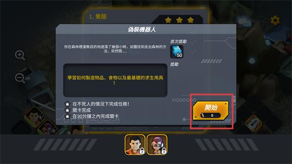 1、进入伪装机器人关卡,点击开始学习制造物品、食物和求生用具,需在无死亡、30分钟内完成关卡,完成后获取奖励,开启策略生存与角色养成的末日挑战。