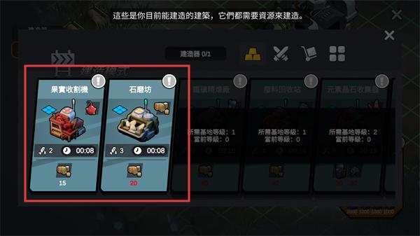 3、在建造界面可选择果实收割机、石磨坊等建筑,这些建筑需要资源和时间建造,建造后可提升基地等级,为生存提供资源保障。