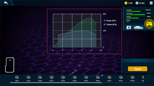 2、进入性能调校界面,查看Power和Torque的曲线图表,调整发动机等参数,优化赛车动力性能,点击Apply应用调校方案,提升竞速表现。