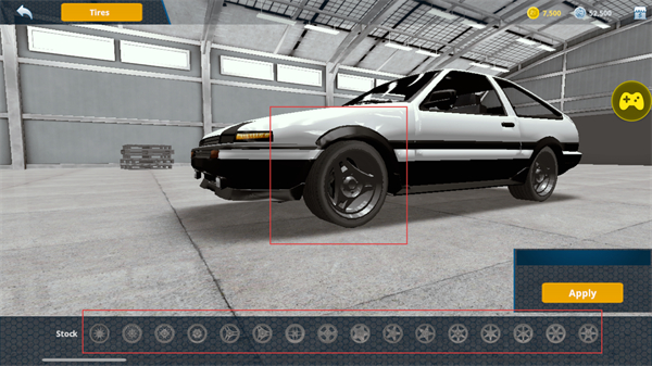 3、进入轮胎界面,选择不同款式的轮毂,调整轮胎样式,点击Apply应用,让赛车外观更具个性,同时优化抓地性能,助力赛道表现。