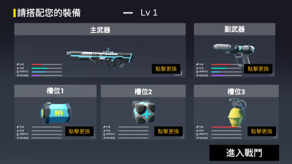 2、 装备界面点击“配备更换”,选激光充能手枪等武器,搭配弹药箱,优化初始战力。
