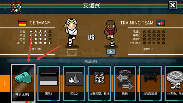 1、点击开始比赛按钮进入友谊赛模式,选定德国队与训练队后,双方队伍将进入赛场准备开启对决。