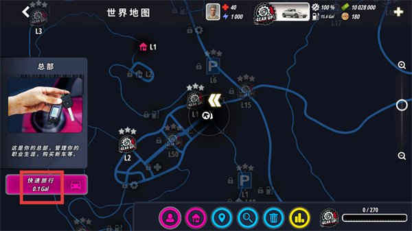 1、点击总部界面的快速旅行按钮,角色会直接前往对应车辆位置,省去手动移动的过程,快速进入驾驶准备状态。