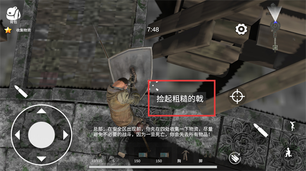 3、点击捡起粗糙的戟选项,获取该武器,根据总部指令在区域内收集物资。