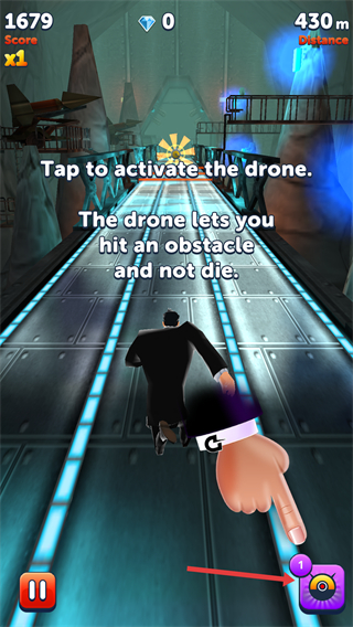 1、点击界面中的无人机图标激活道具,触发后即便撞到障碍也不会淘汰,继续保持跑酷节奏推进距离。