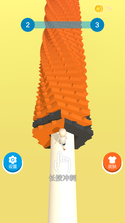 1、游戏中,按住屏幕不放,角色开始用头撞击滚动的墙体,需注意有两种颜色的墙体,黑色墙体不能撞。