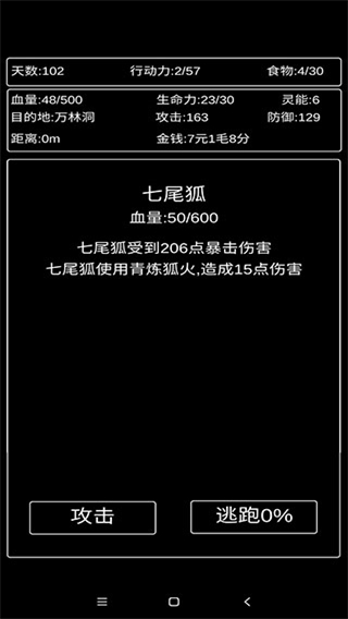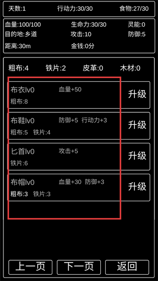 1、点击界面里的返回按钮回到主界面,此时天数增加,食物减少,血量恢复,行动力也回到初始状态。