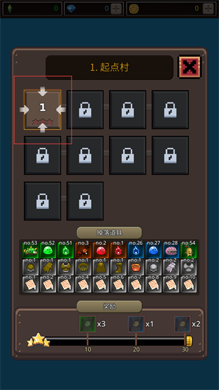 1、进入起点村界面,点击解锁的关卡区域,准备进入对应的战斗场景,同时可查看奖励和装备信息。