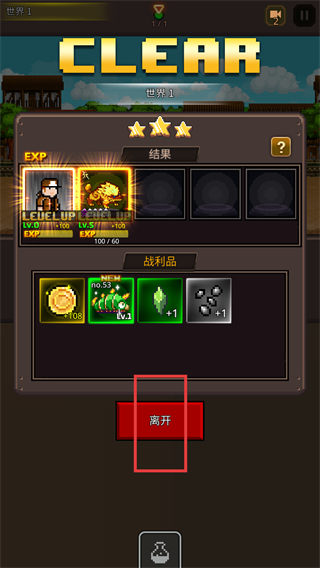 4、战斗胜利后界面显示CLEAR,获取对应的EXP和战利品,点击离开按钮退出当前战斗界面。