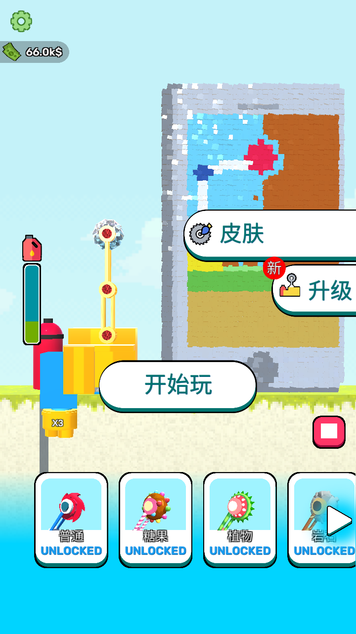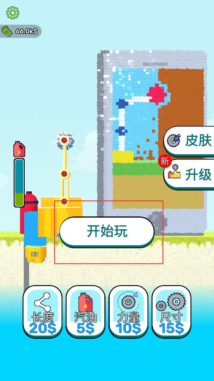 1、进入游戏,点击开始玩按钮,就能开启拆墙的解压之旅,准备使用工具拆除墙体。