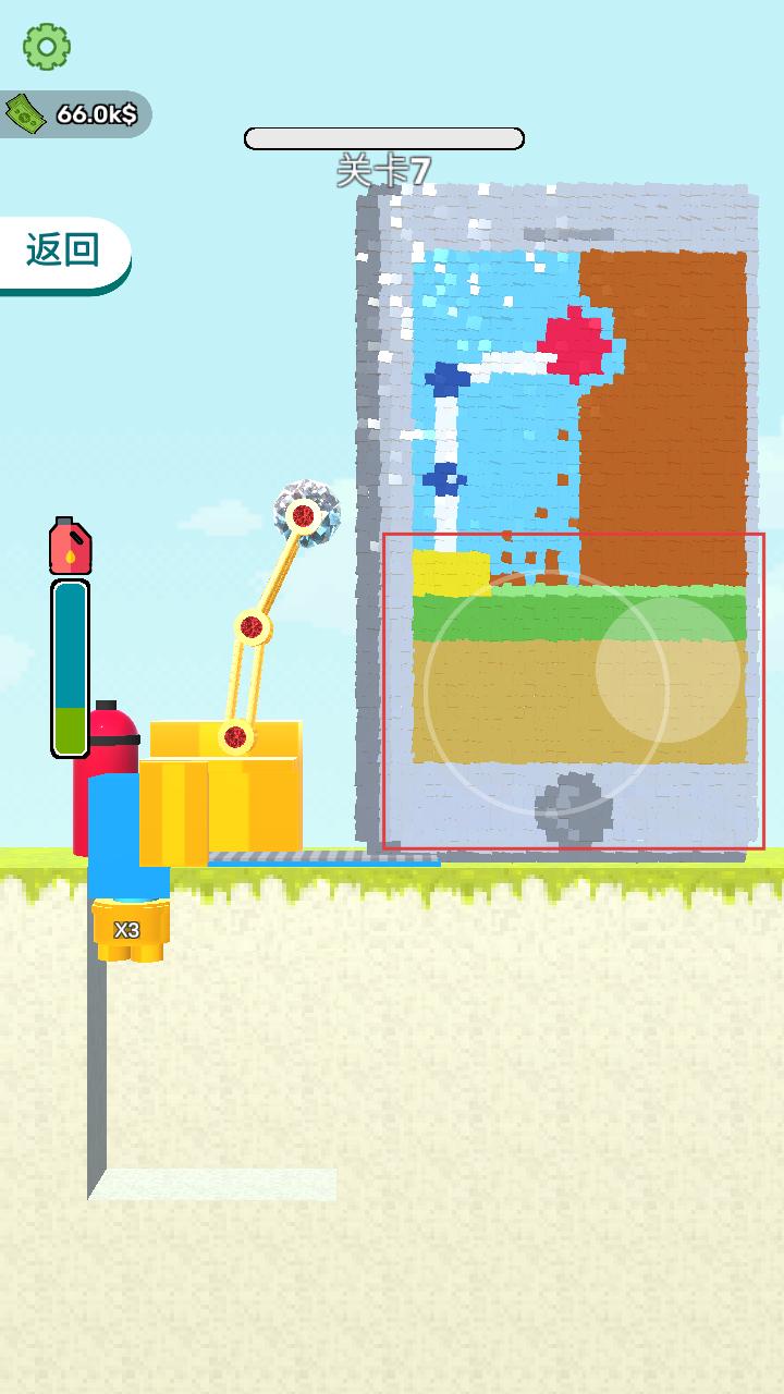 2、在关卡中通过操作屏幕上的虚拟按键,控制拆墙工具的移动和工作,对准墙体进行拆除。