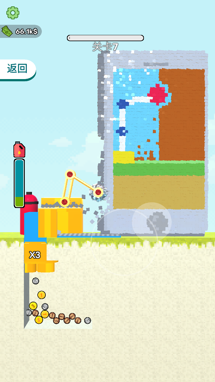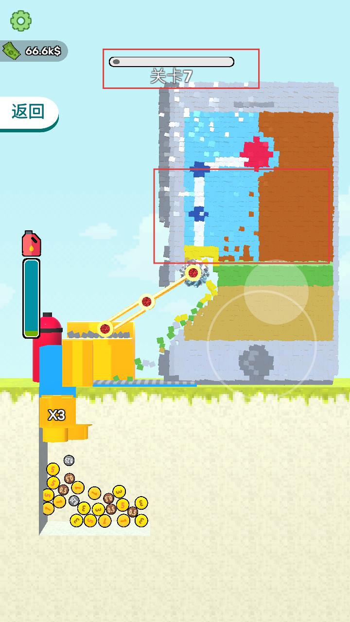 3、拆除墙体时,能看到墙体碎片飞溅,同时上方的进度条会显示关卡进度,努力推进拆除进程。