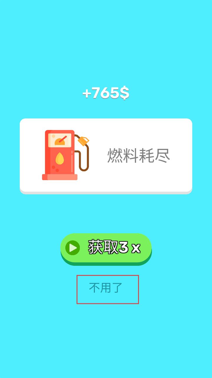 4、若出现燃料耗尽的提示,可选择获取燃料继续游戏,或者点击不用了,结束当前关卡。