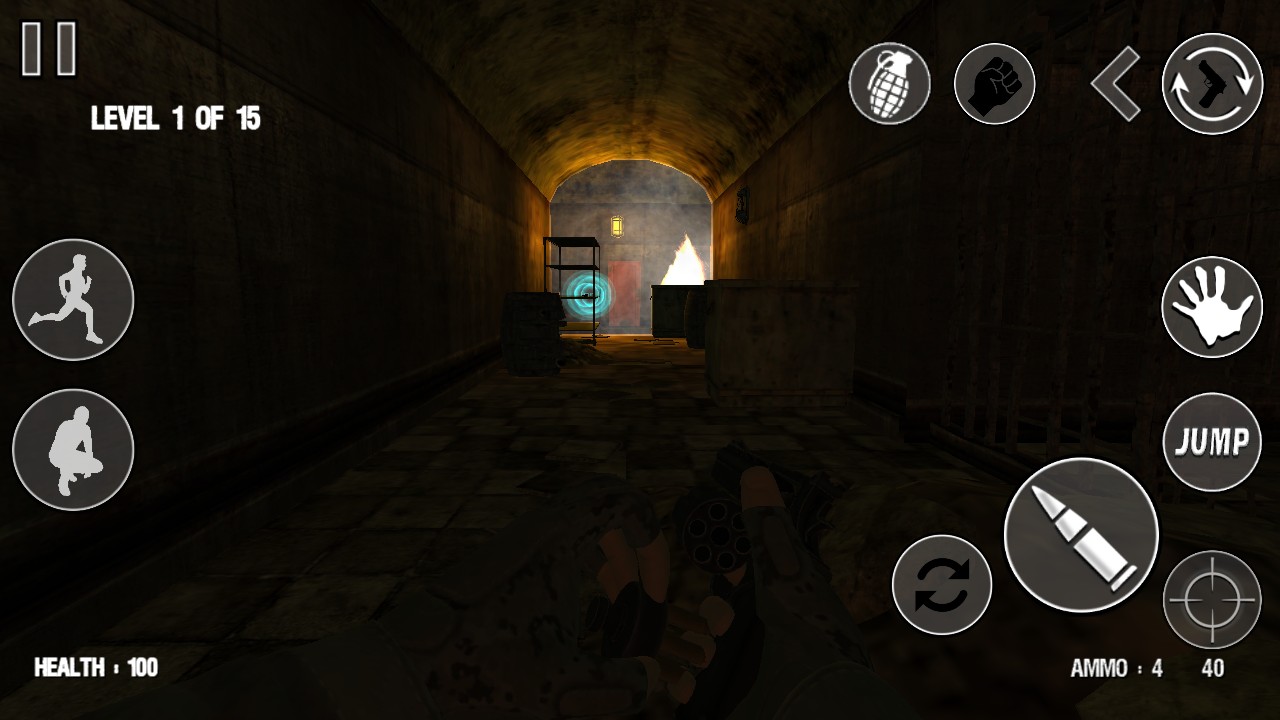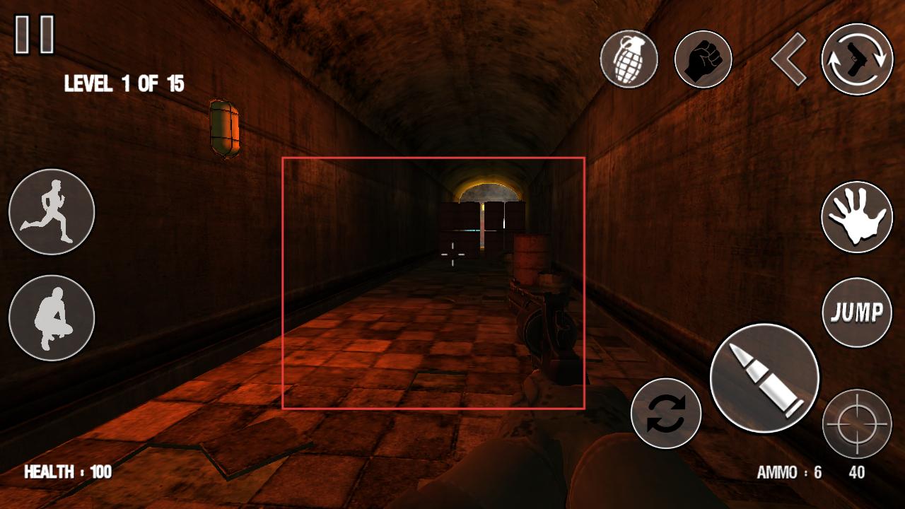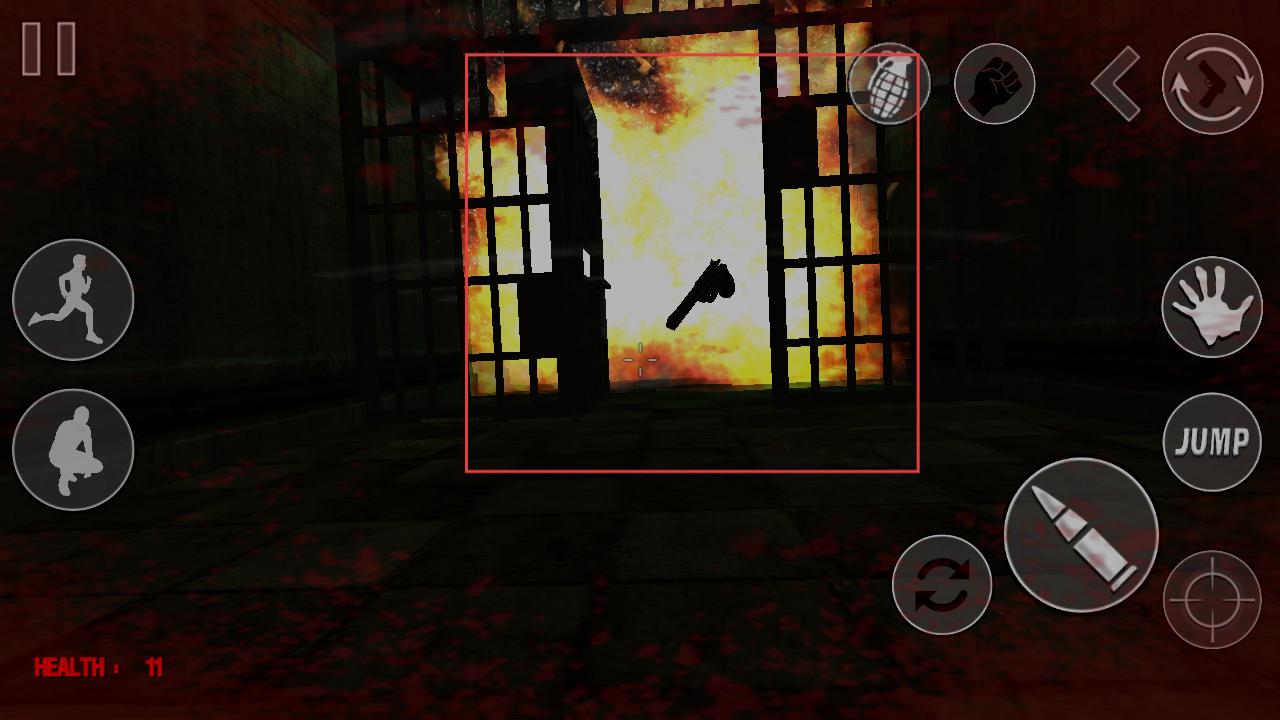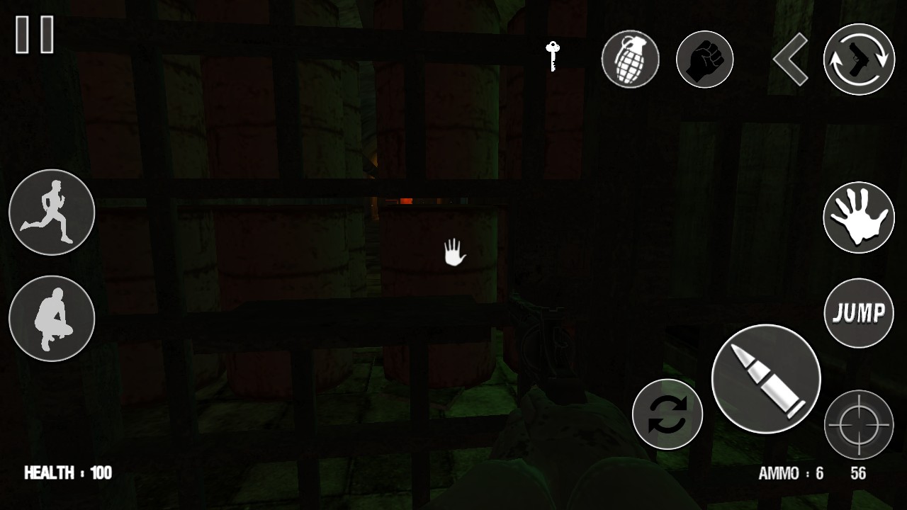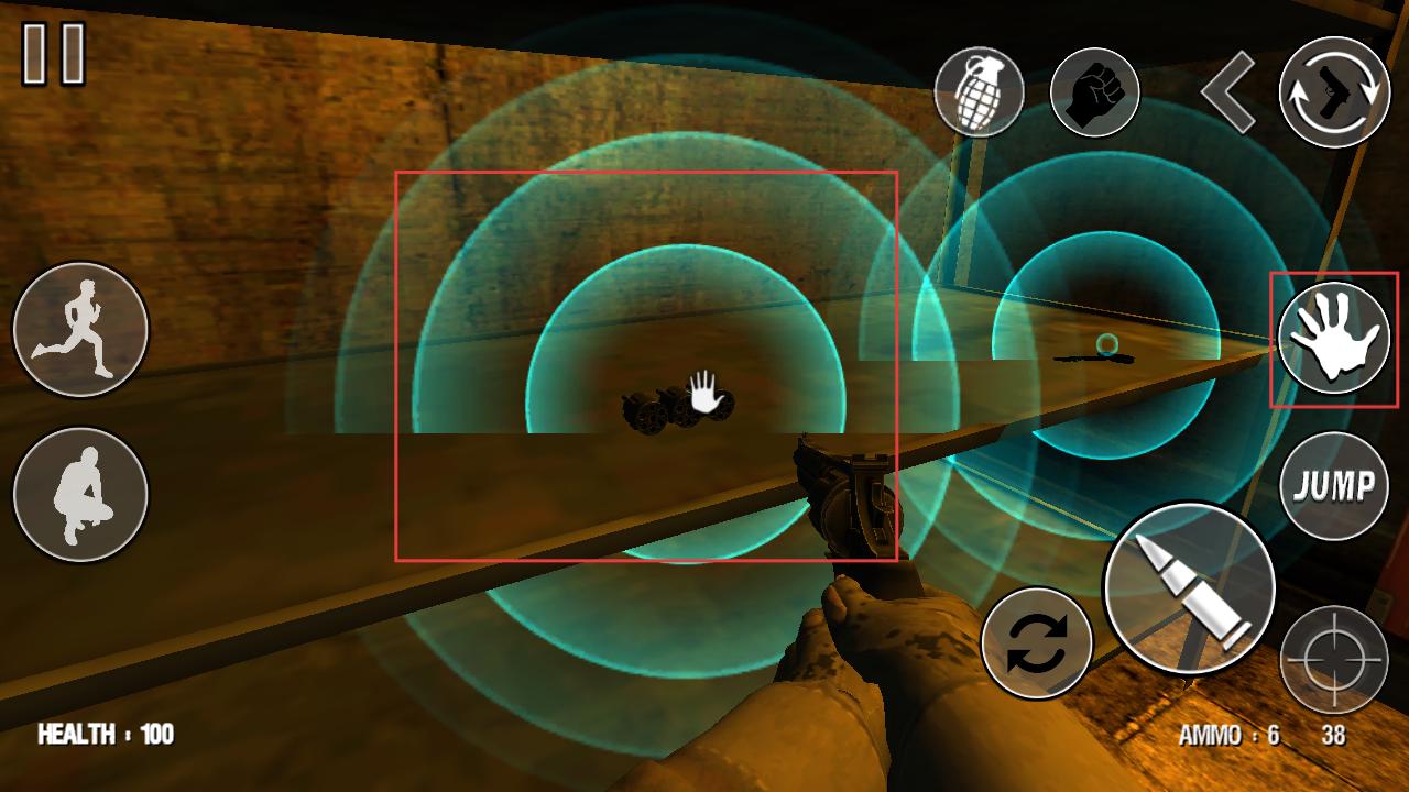 2、进入游戏后,左侧有奔跑、蹲下按钮,右侧有投掷手雷、出拳、跳跃等操作按钮,操控角色在场景中探索前行。