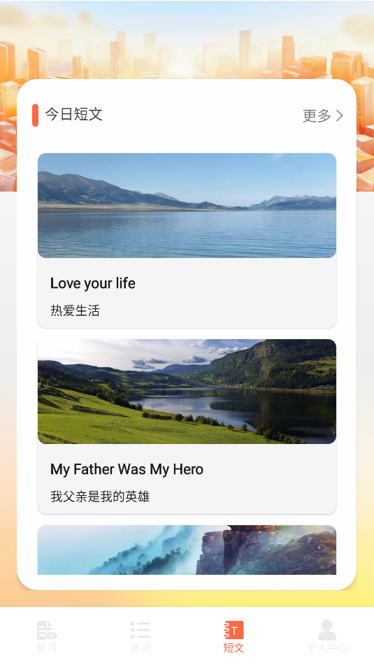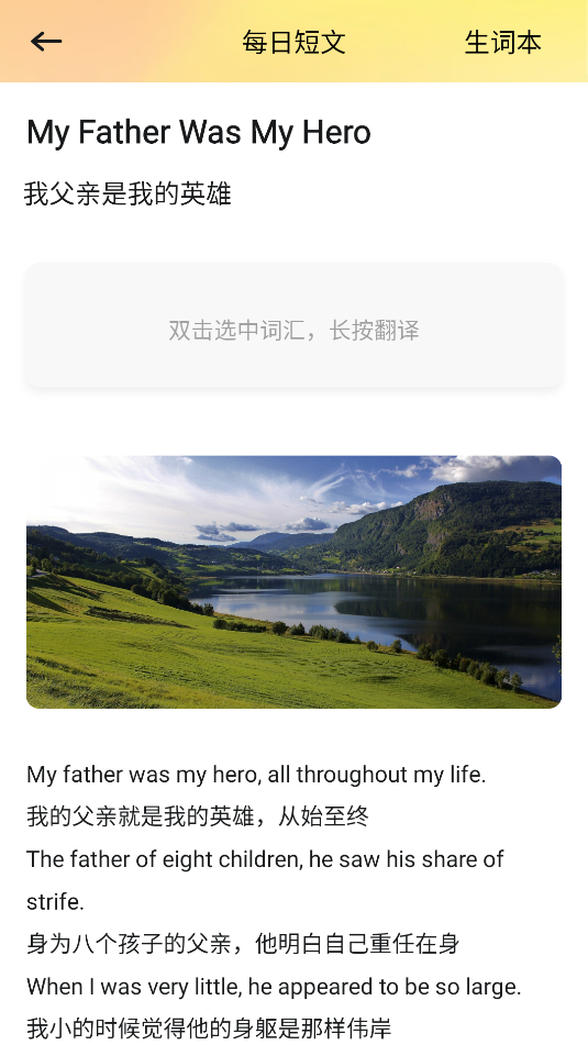 3、每日推送精选短文,支持标记生词整理成册,兼具中英互译功能。