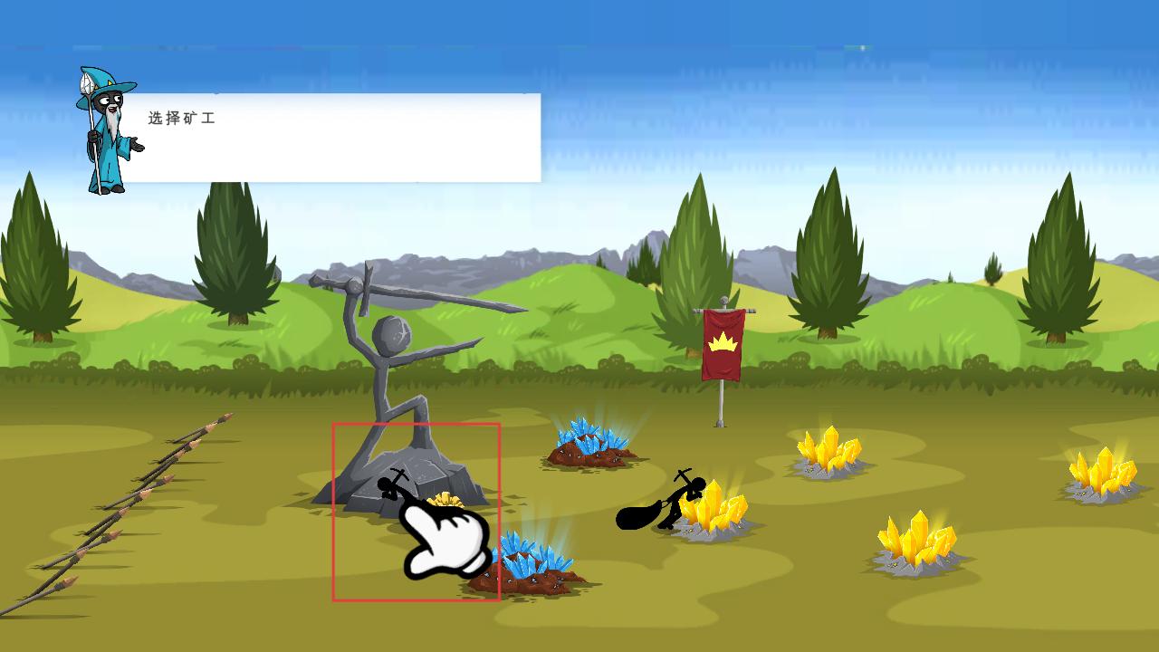 2、在场景中按照提示选择矿工,矿工可去采集资源,为后续建立军队等操作提供物资支持。
