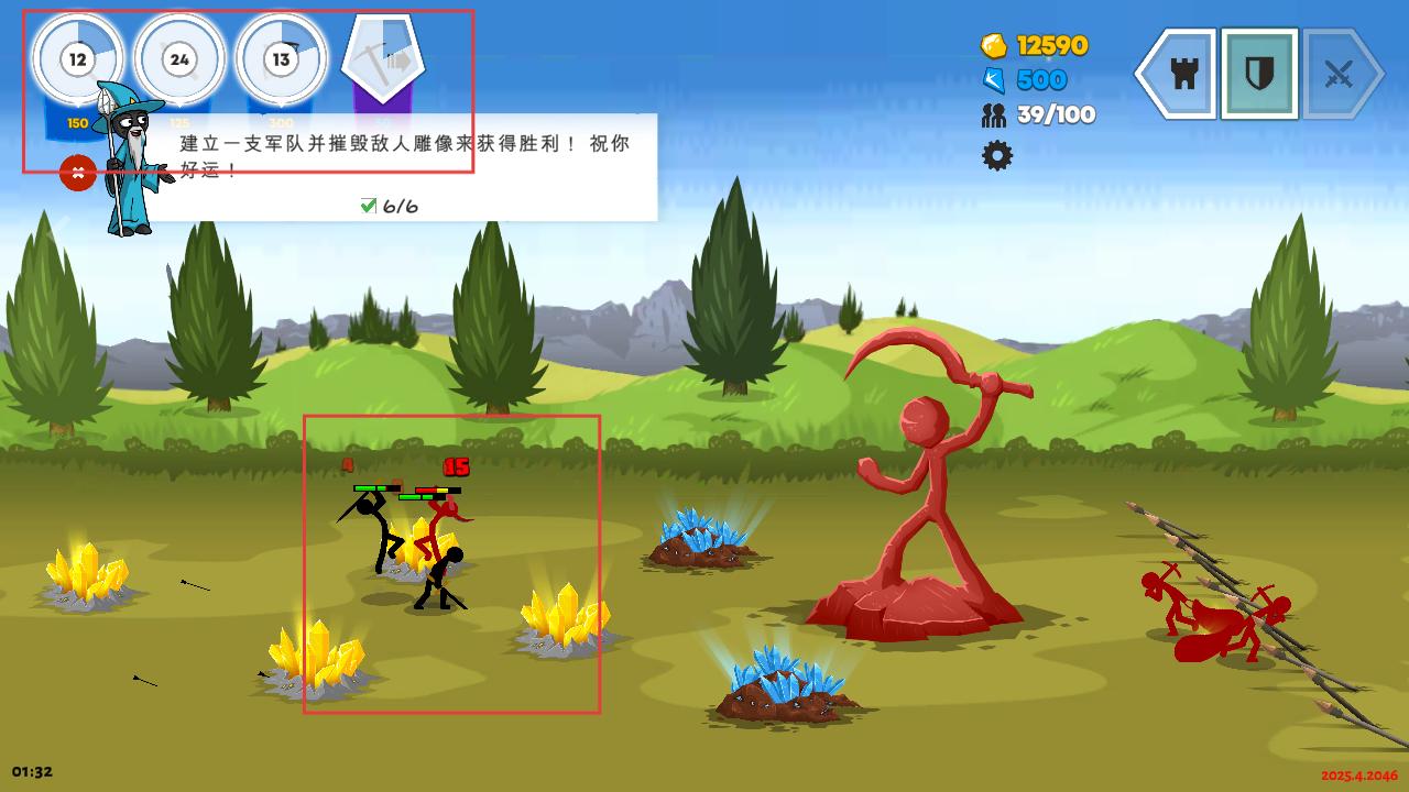 3、根据提示建立军队,指挥军队与敌人战斗,同时要关注资源数量等信息,合理调配兵力去摧毁敌人雕像。