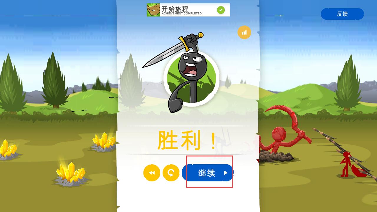 4、成功摧毁敌人雕像后,会出现胜利界面,点击继续按钮,可进入下一段游戏旅程。