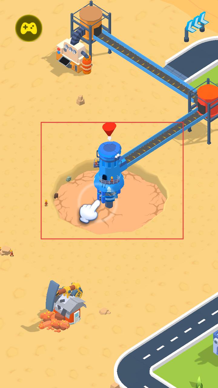 1、点击蓝色挖掘机开始挖掘矿产,挖掘机通过传送带将矿石输送至后续设施,开启资源开采的第一步,逐步积累矿产资源。