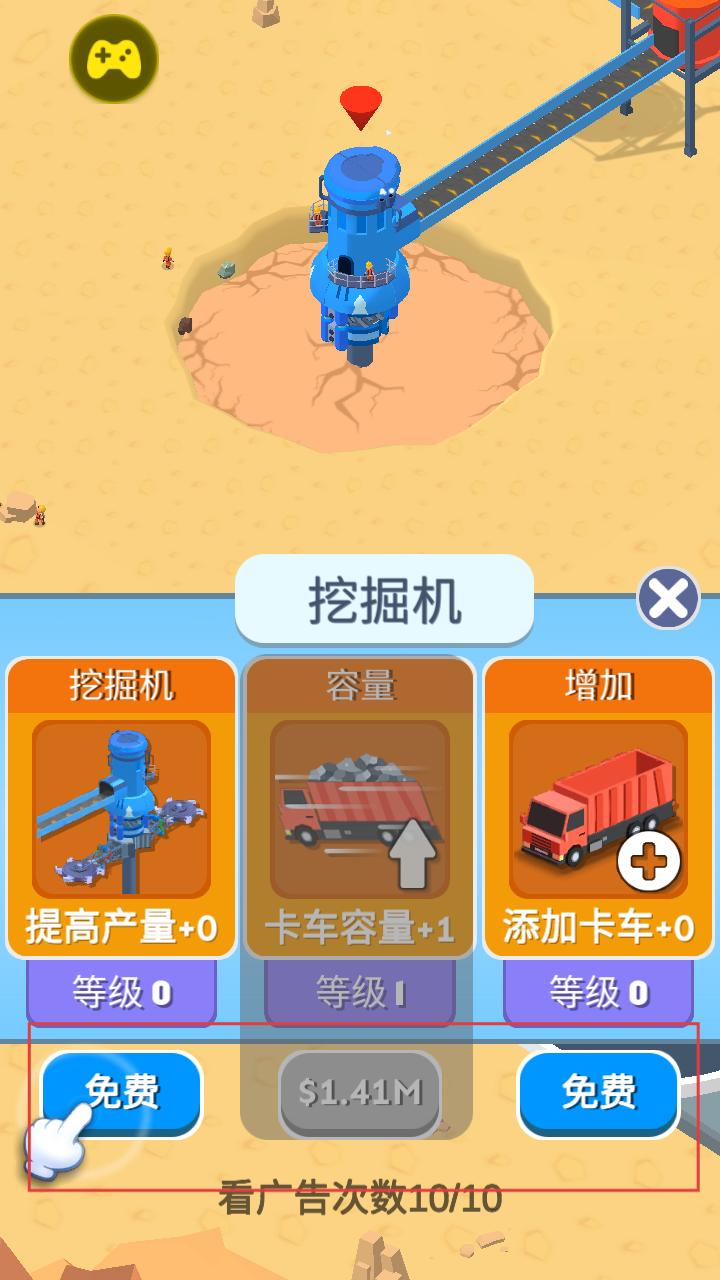 2、进入挖掘机升级界面,可选择免费升级挖掘机产量、卡车容量等,提升开采和运输效率,助力矿产经营规模扩大。