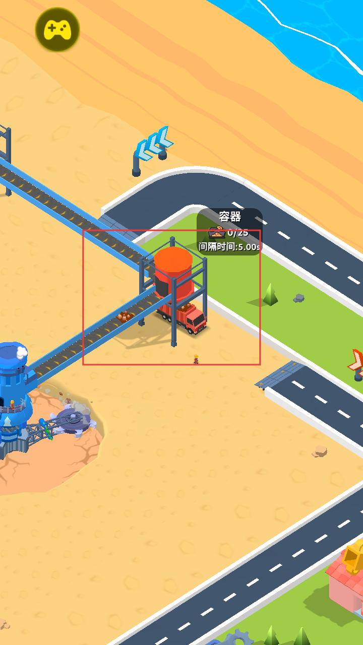 3、矿石经传送带运至容器处,红色卡车在容器旁装载矿石,界面显示容器容量和间隔时间,合理安排装载流程。