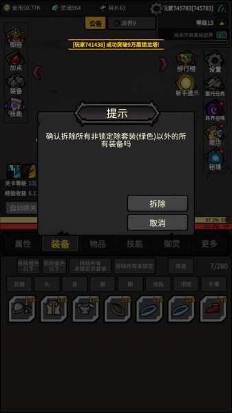 3、装备处理技巧:自动分解白色垃圾装备,保留带蓝色词条的装备,优先强化武器与戒指提升输出。
